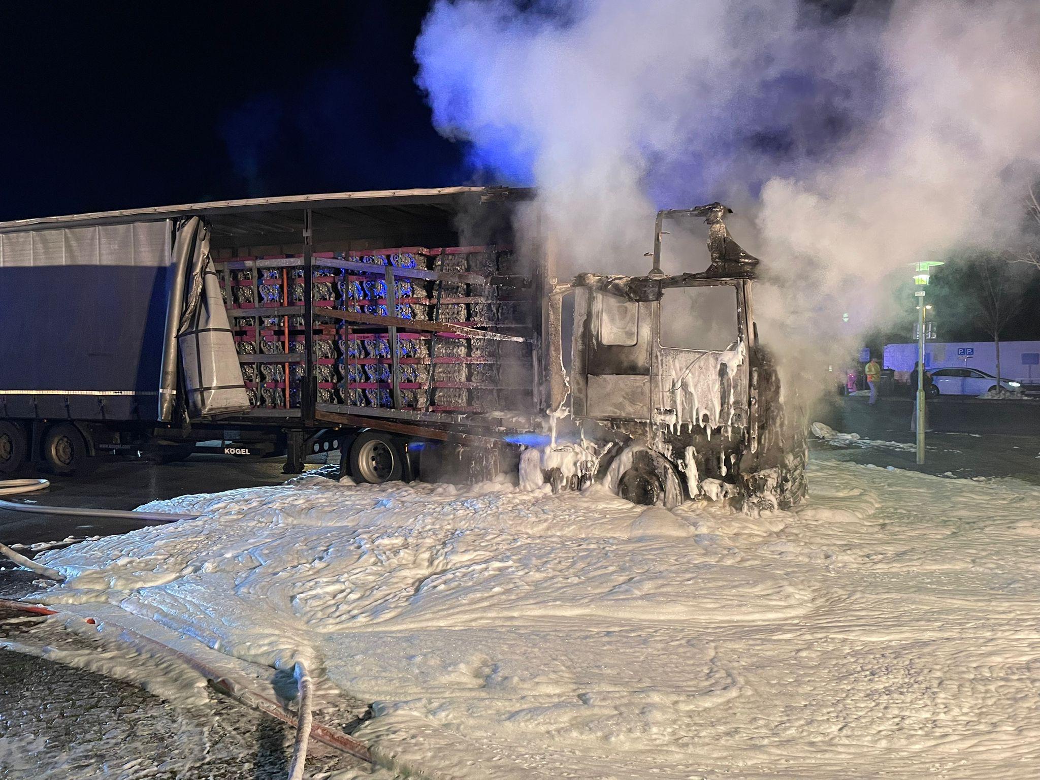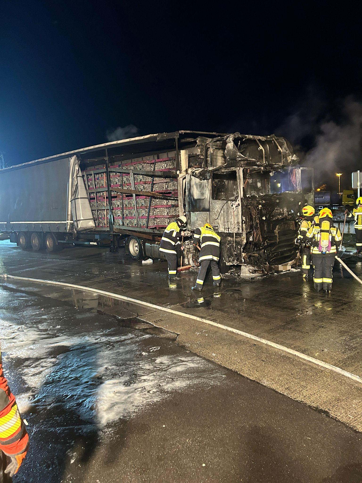 Zu einem LKW-Brand auf der Rastanlage Bayerwald Süd (BAB 3) wurden die Feuerwehren Hunderdorf und Bogen am Mittwoch, 26.11.2025 gegen 17:25 Uhr gerufen. Als die FF Hunderdorf an der Einsatzstelle ankam, stand das Führerhaus bereits in Vollbrand und das Feuer drohte auf den Auflieger überzugreifen, welcher mit Metallteilen beladen war. Unter Einsatz eines Atemschutztrupps mit einem C-Rohr konnte die Brandausbreitung verhindert werden. Im Anschluss unterstützte die FF Bogen und löschte das Führerhaus mittels Schaumrohr ab.